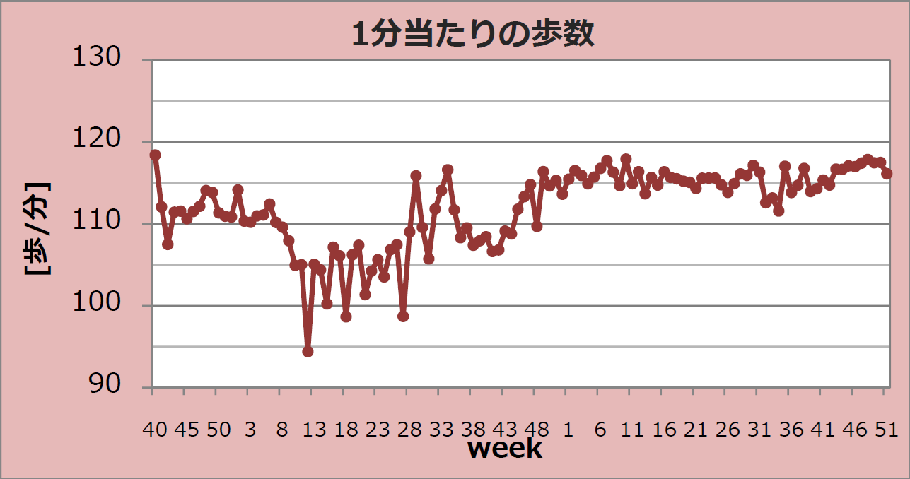 「1分当たりの歩数」グラフを見ると、この一年間は安定しているのがわかります。