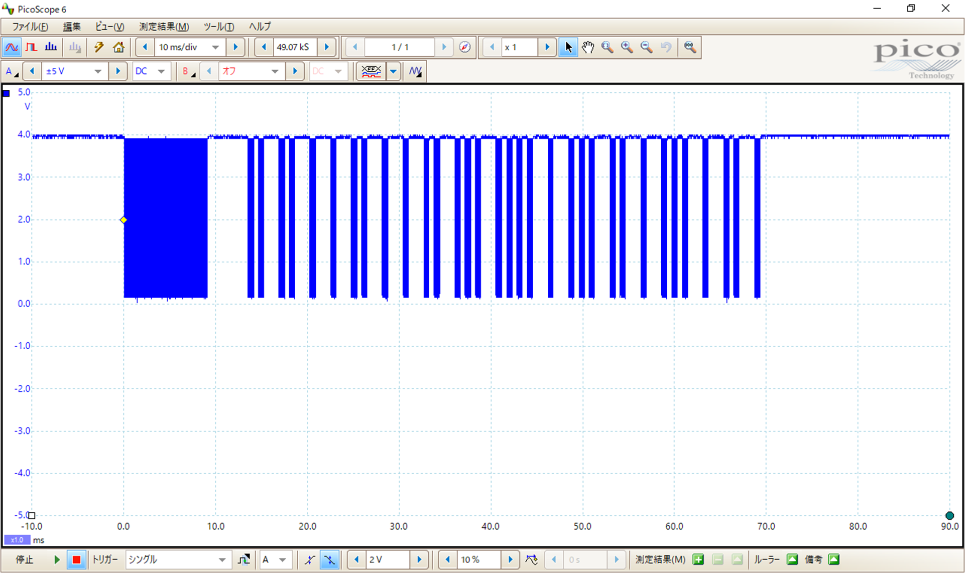 図4 に赤外線送信回路出力波形例を示します。LED1 が発光している波形を直接見ることはできないので、Q2 のコレクタ(C)波形を見ています。
