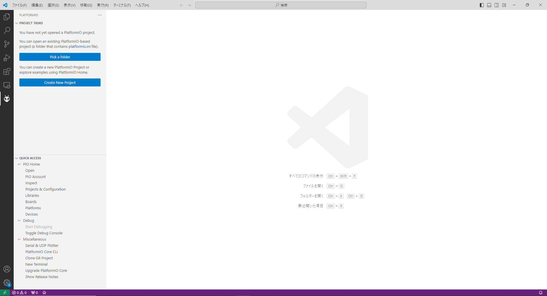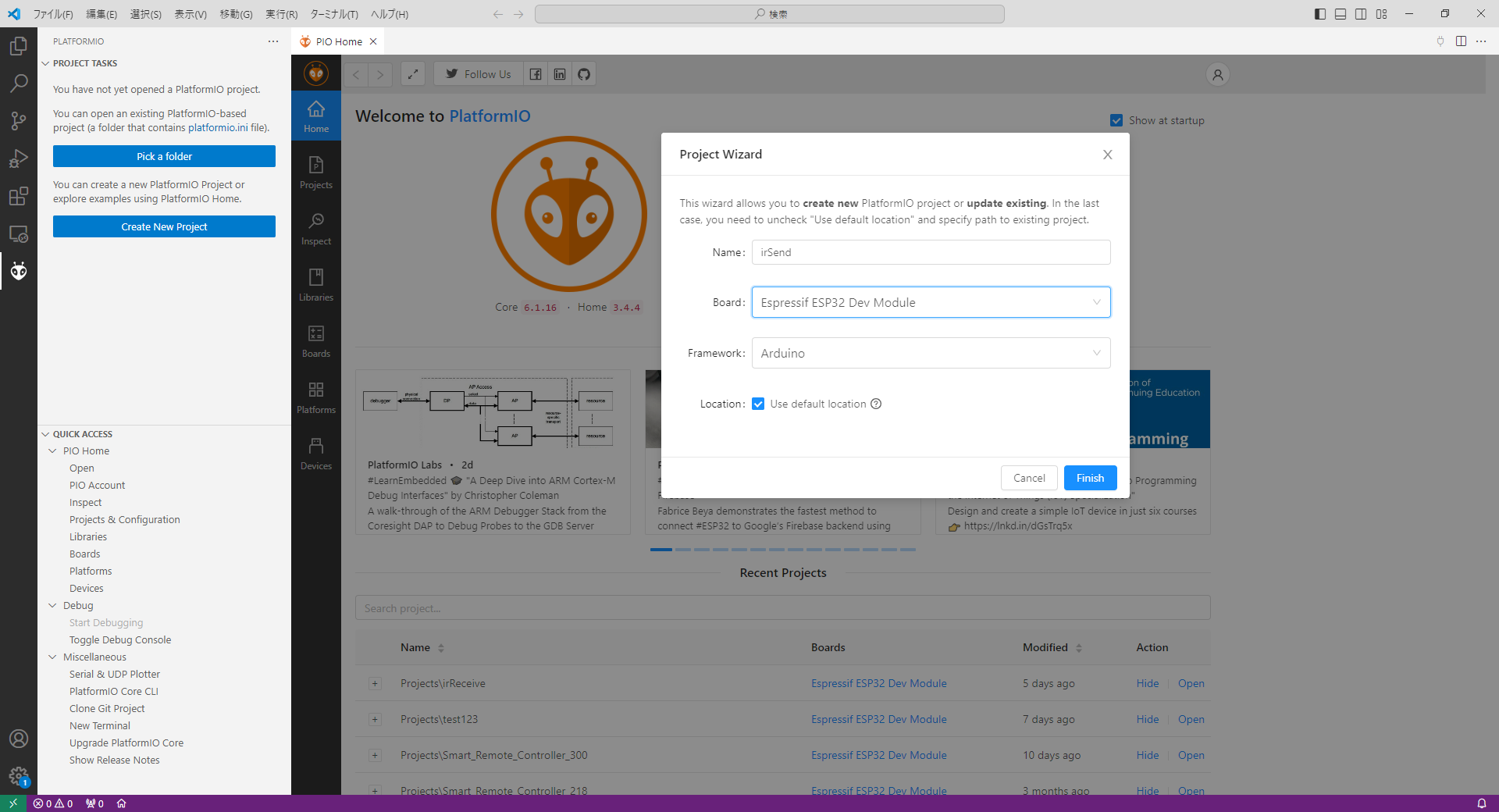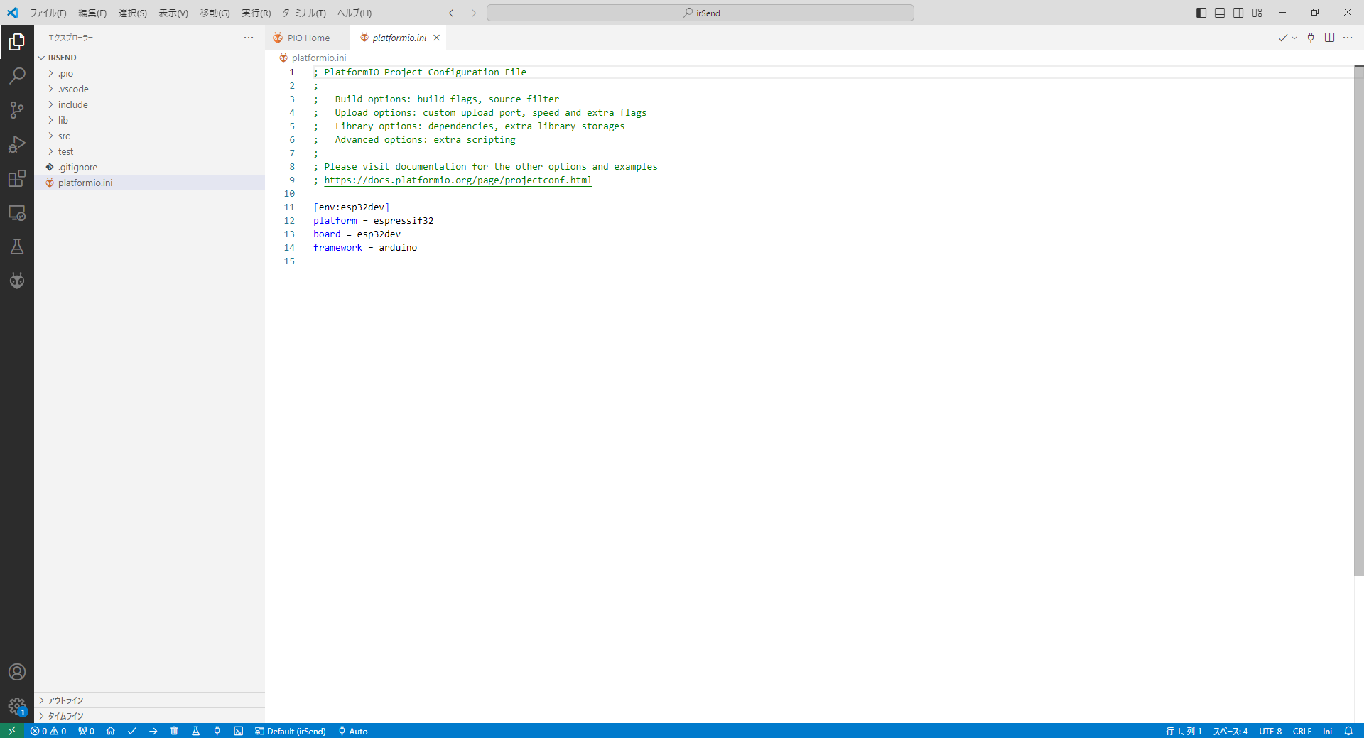 Framework: Arduino (プルダウンメニューから選択します)
