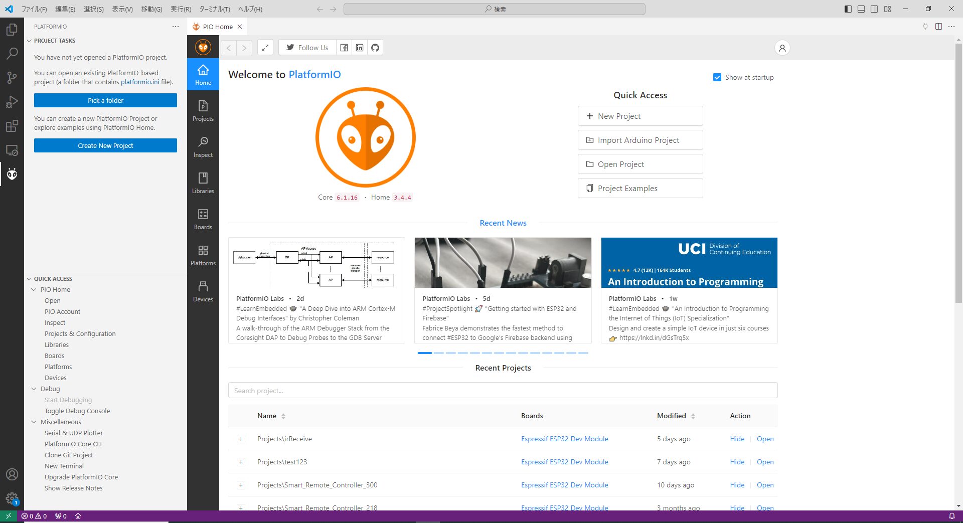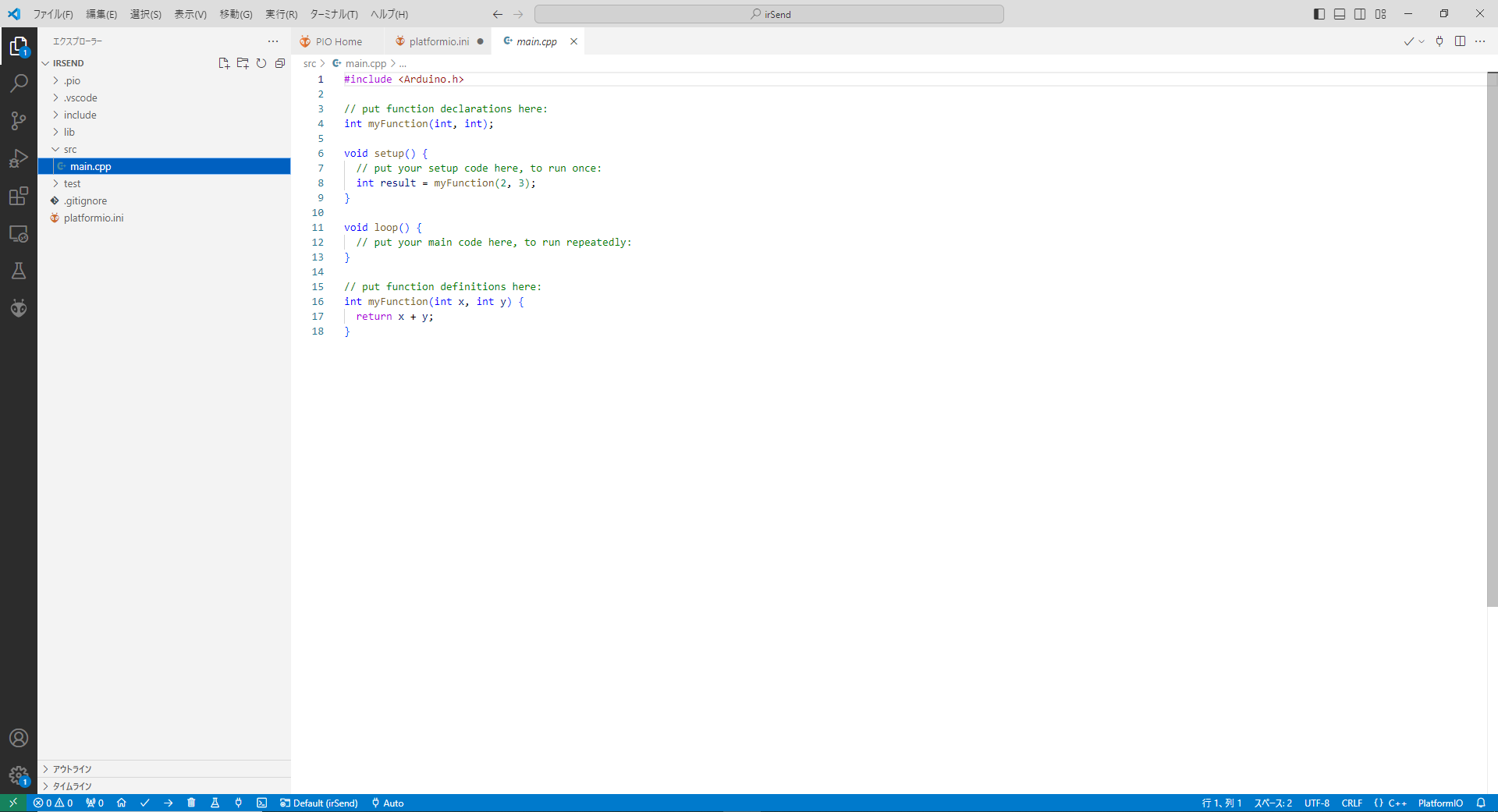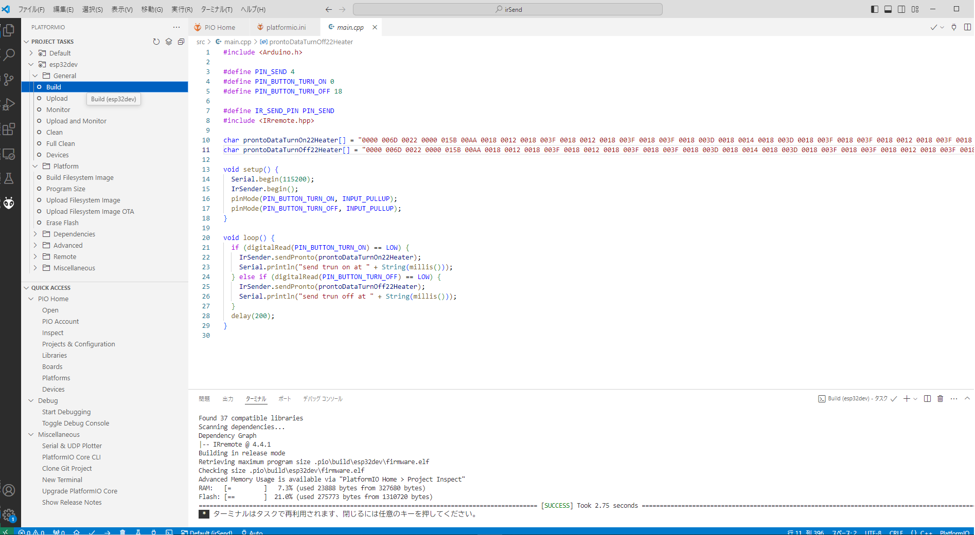 IRremote のライブラリが必要になります。IRremote は platformio.ini にライブラリ依存性を定義すると自動的にインストールされます。