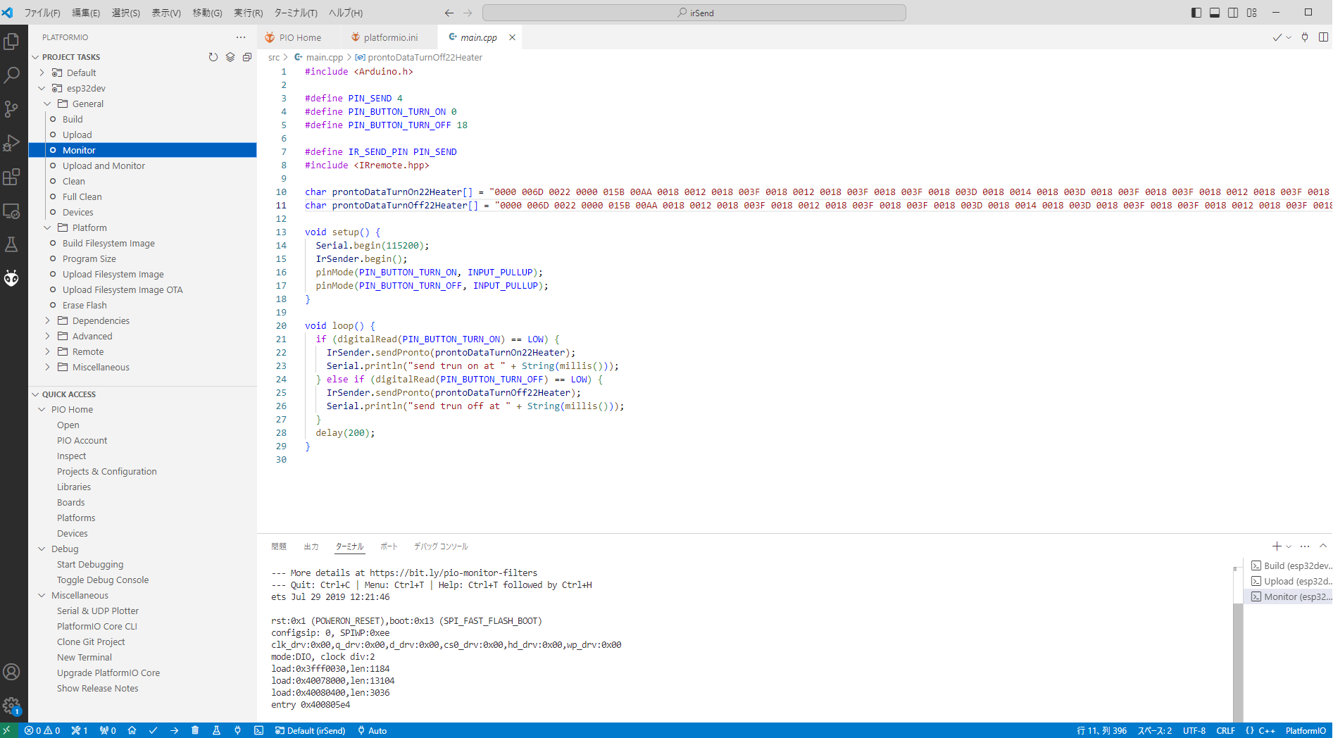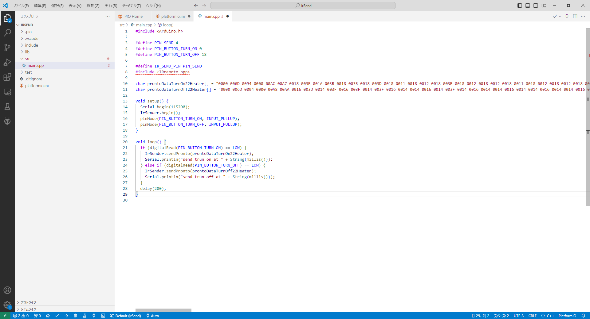 Arduino(ESP32)でエアコンの赤外線リモコンの信号をコピーして発信する」から「先ほどメモしたprontoの情報を使ってプログラムを作成」にあるプログラムをコピーして main.cpp にペーストします。(図11)