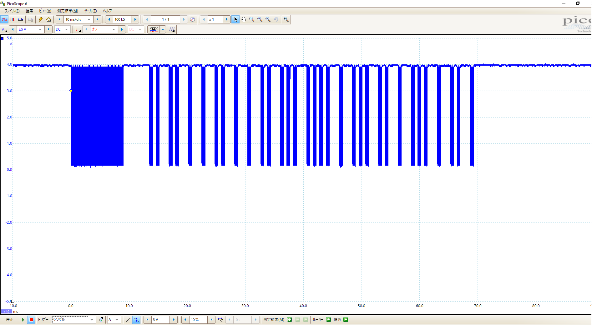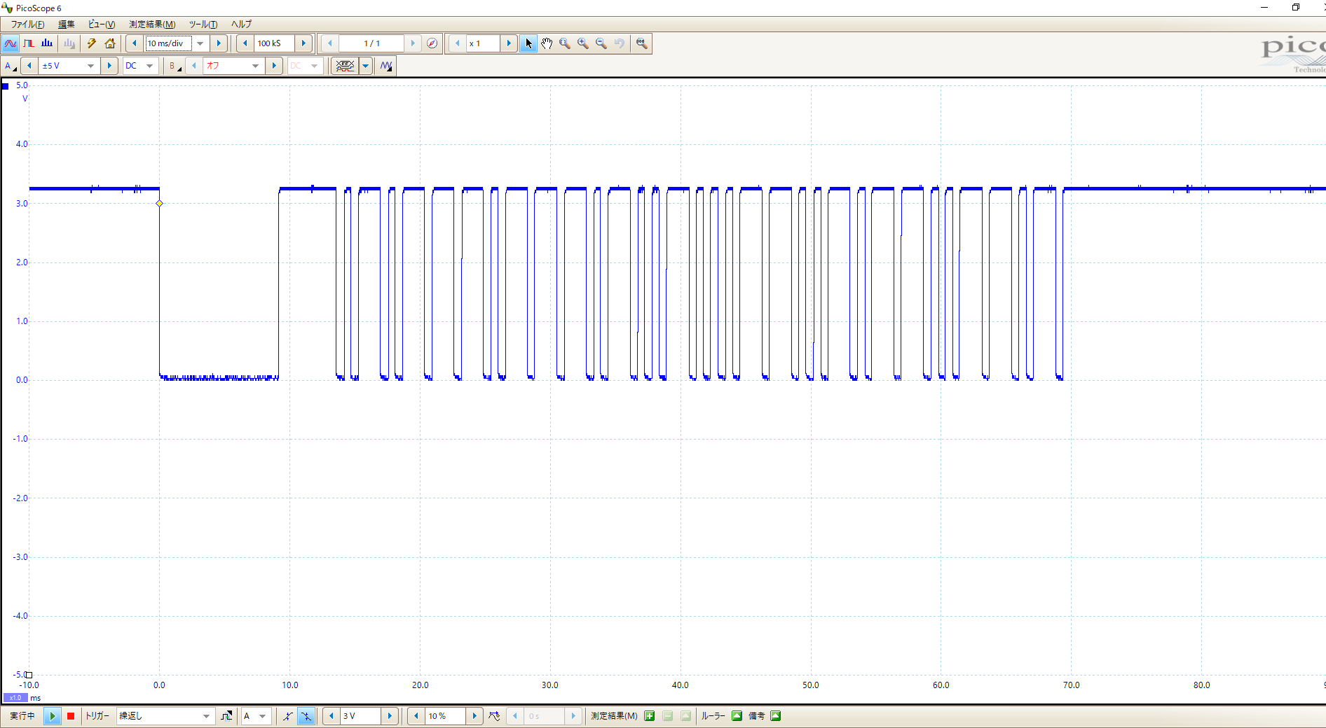 この信号は main.cpp の10 行目に設定したデータに対応しています。(本稿では 18 番ピンにボタンを設けていないので 11 行目に設定したデータは送信されません。)