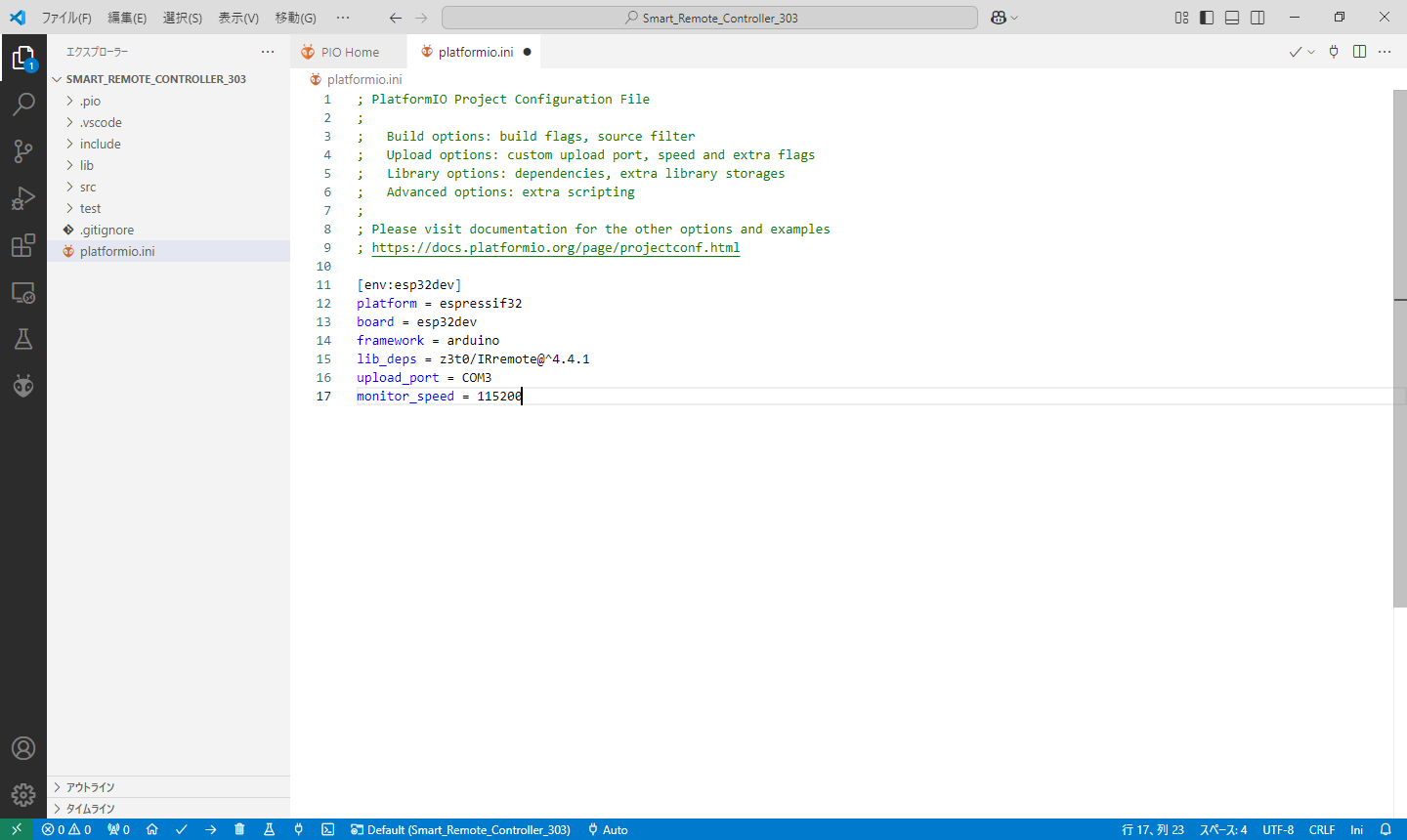自動生成されたプロジェクトに追加、変更を加えて本機のプロジェクトに対応させます。 platformio.ini ファイルに以下の 3 行を追加します。(図7)lib_deps = lib_deps = z3t0/IRremote@^4.4.1 (ライブラリ名を訂正しました)