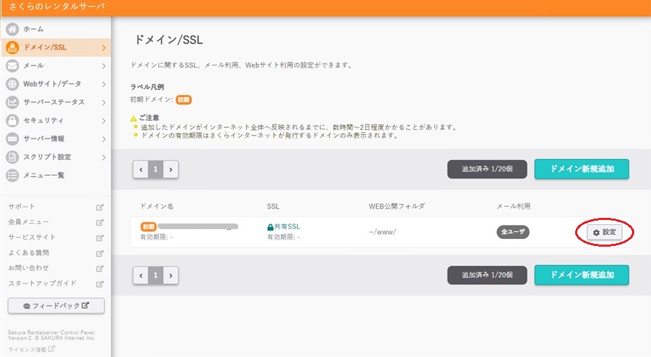 (2)ドメイン一覧画面から、該当ドメインの『設定』をクリックします。(図5)