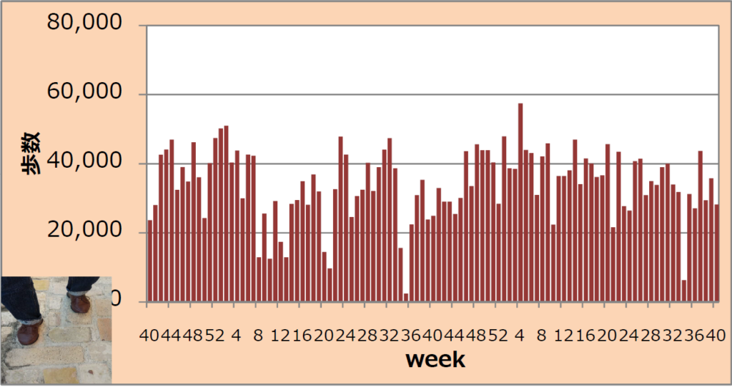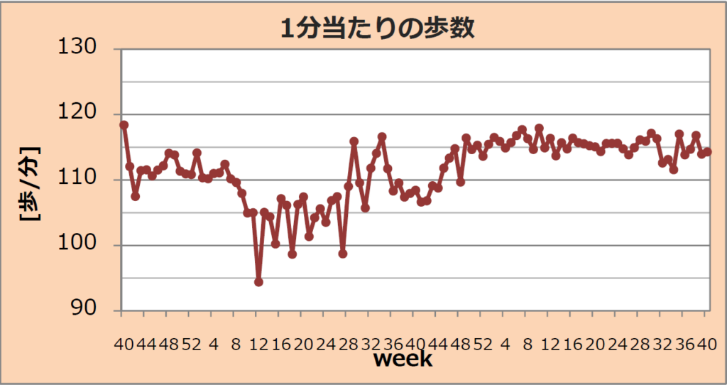 40 週は腰痛の影響があるものの 1 分当たり歩数は 114 歩/分で全平均 112 歩/分を少し上回ることができました。