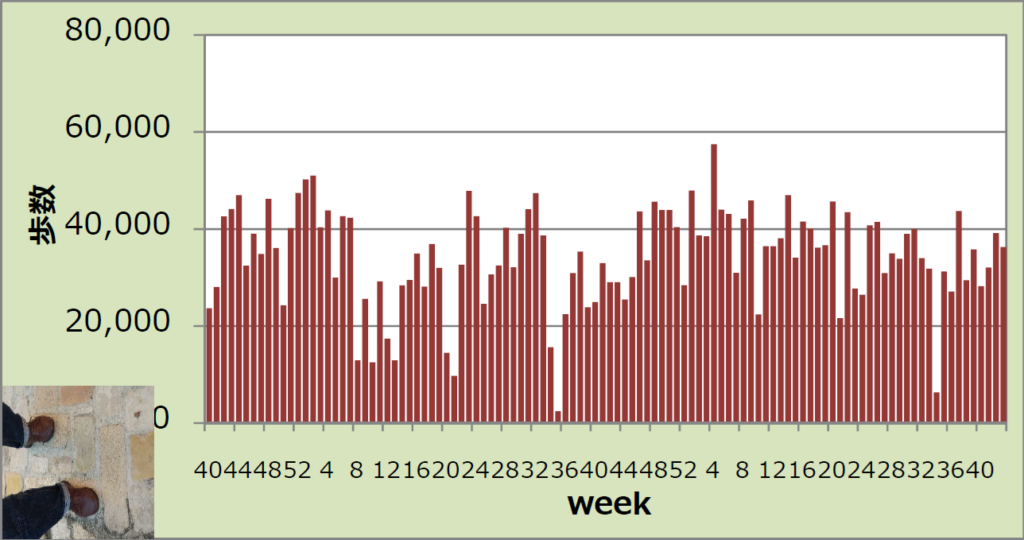 42 週のウォーキングは雨で 3 回、ゴルフで 3 回スキップして計 15 回になりました。