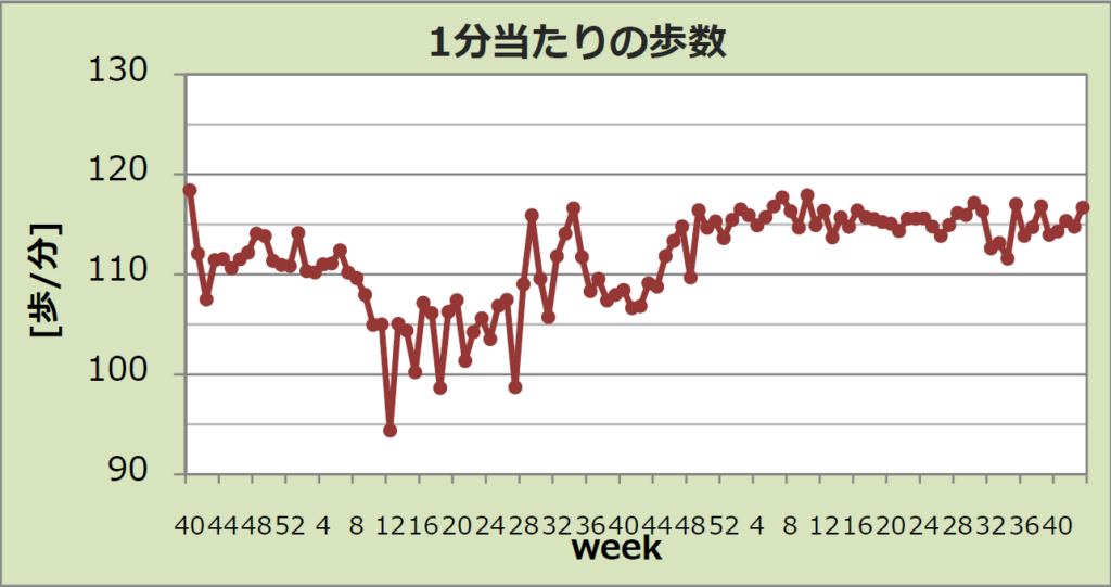 43 週は 1 分当たり歩数が 117 歩/分で全平均 112 歩/分を上回っています。 気温が下がってきた方が汗をかくことも無くて歩きやすいようです。