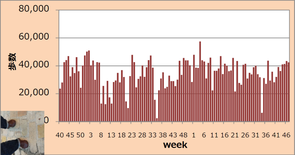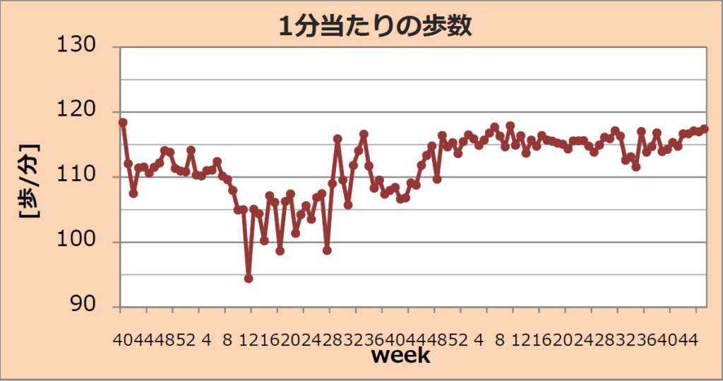 47 週は 1 分当たり歩数が 117 歩/分で全平均 112 歩/分を上回っています。 寒くなってきて速く歩けるようになりました。