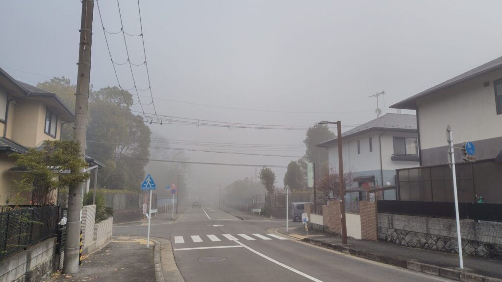 盆地の町の中心部は住んでいるところよりも100mほど低いので霧も濃くなっていて溜まっている感じで晴れるまでに時間がかかります。