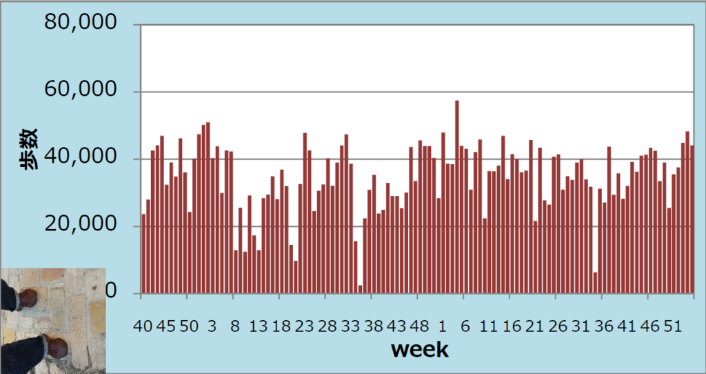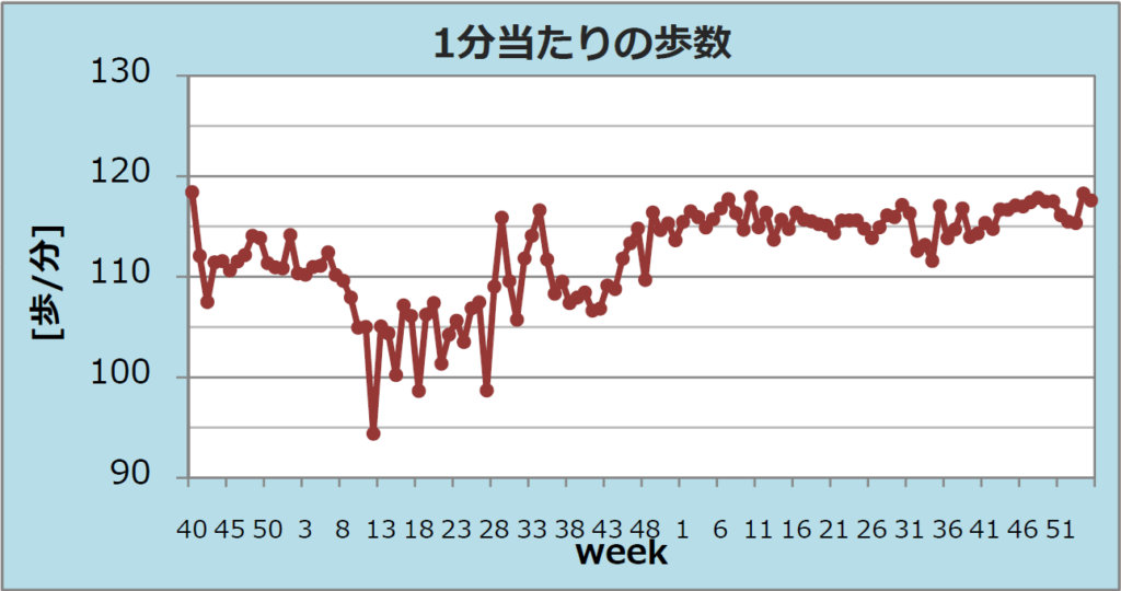 03 週も足腰の不調が少なかったためでしょうか 1 分当たり歩数が 118 歩/分と全平均 112 歩/分を十分上回っています。
