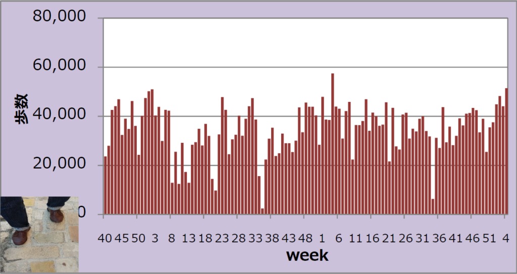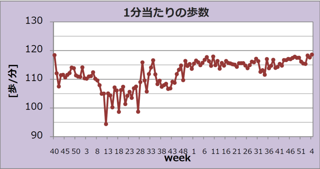04 週も足腰の不調が少なかったためでしょうか 1 分当たり歩数は 118 歩/分と全平均 112 歩/分を十分上回っています。