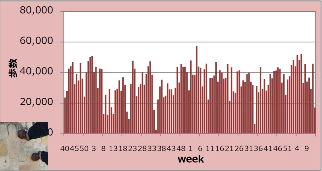 13 週のウォーキングは降雨で 1 回、副鼻腔炎で 7 回、旅行で 8回スキップして計 5 回でした。